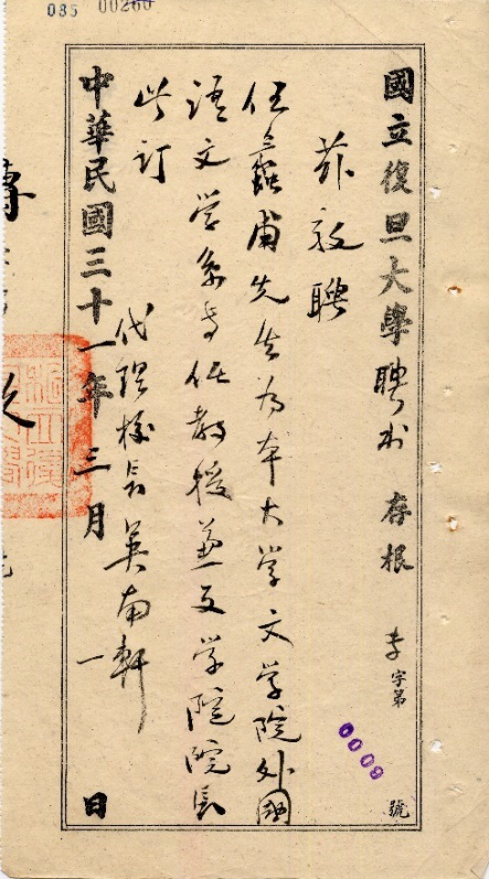 伍蠡甫教授担任文学院院长的聘书 |